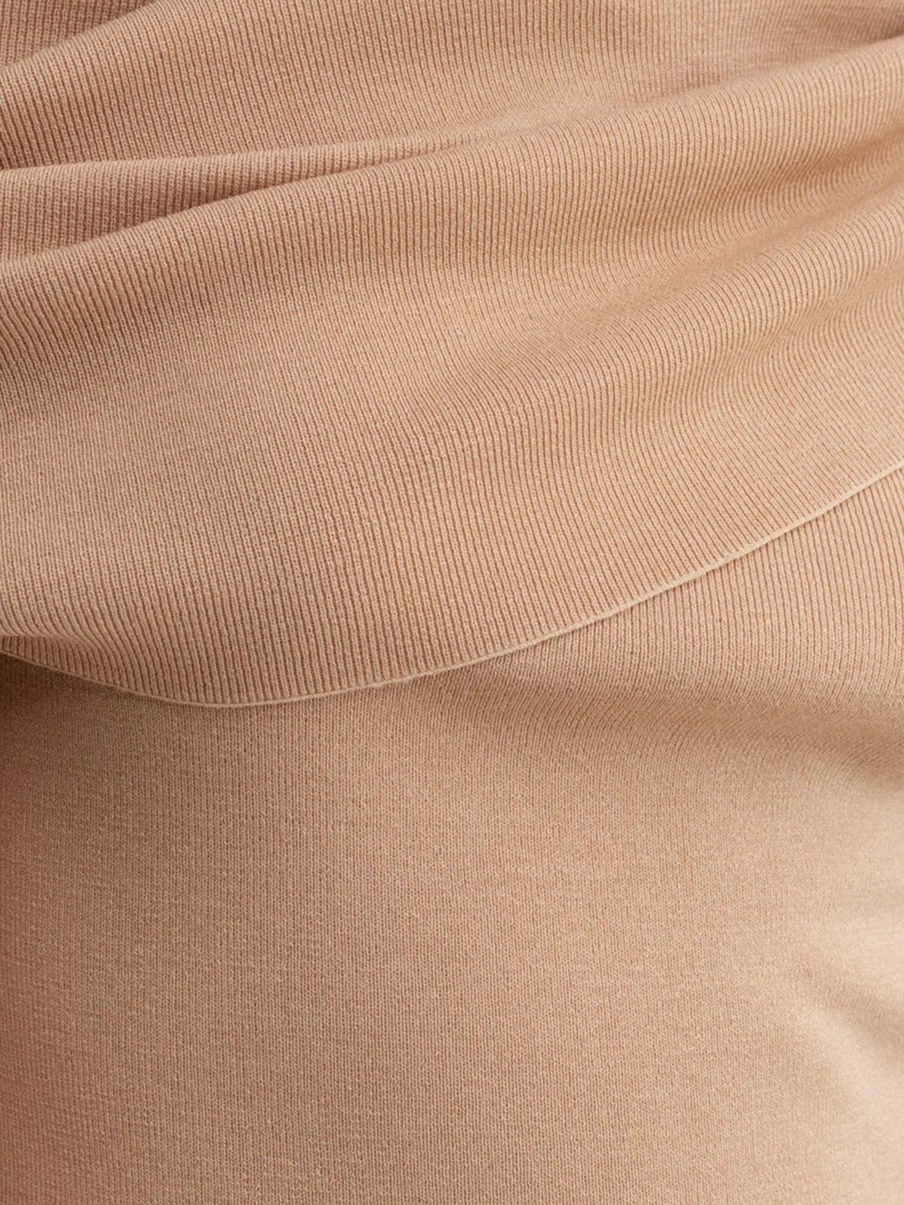 A blend of wool and silk, combining the natural softness of wool with the smooth elegance of silk. The fabric has a crisp hand-feel and a dense, compact knit structure, giving it a clean and refined appearance.