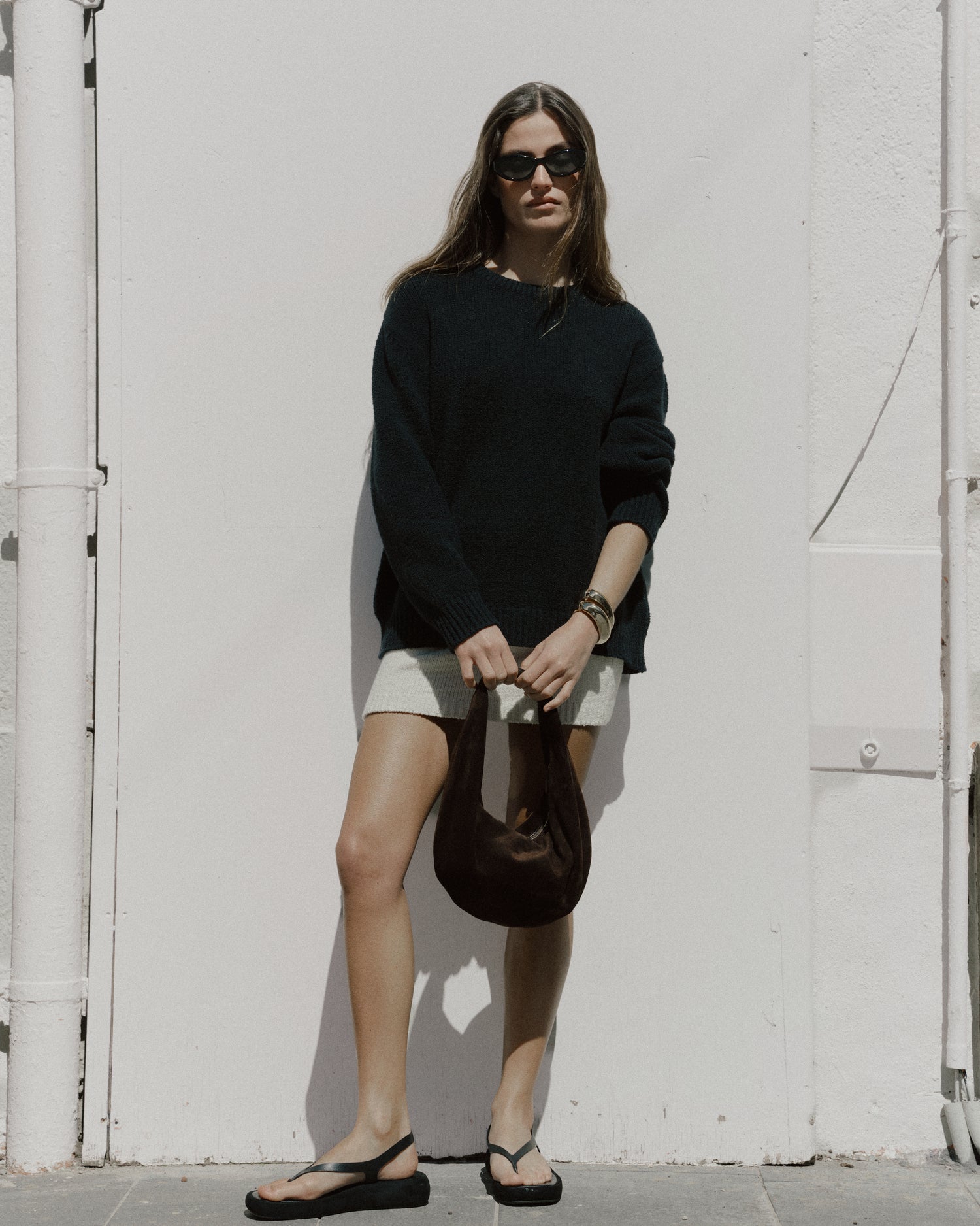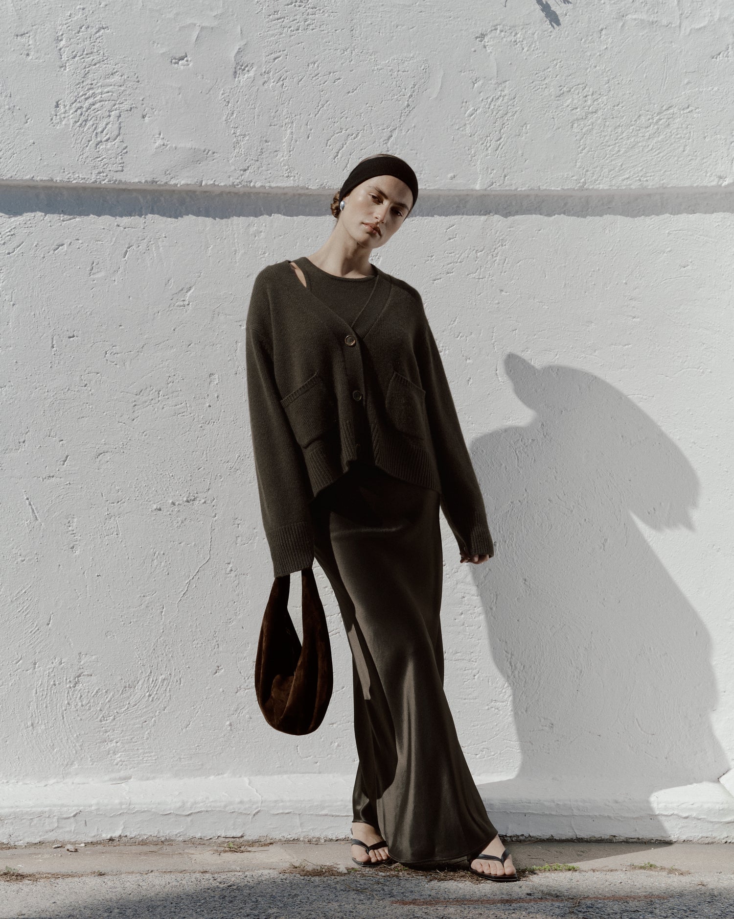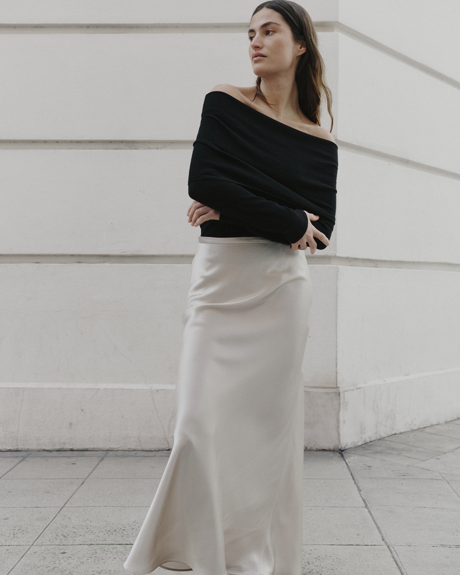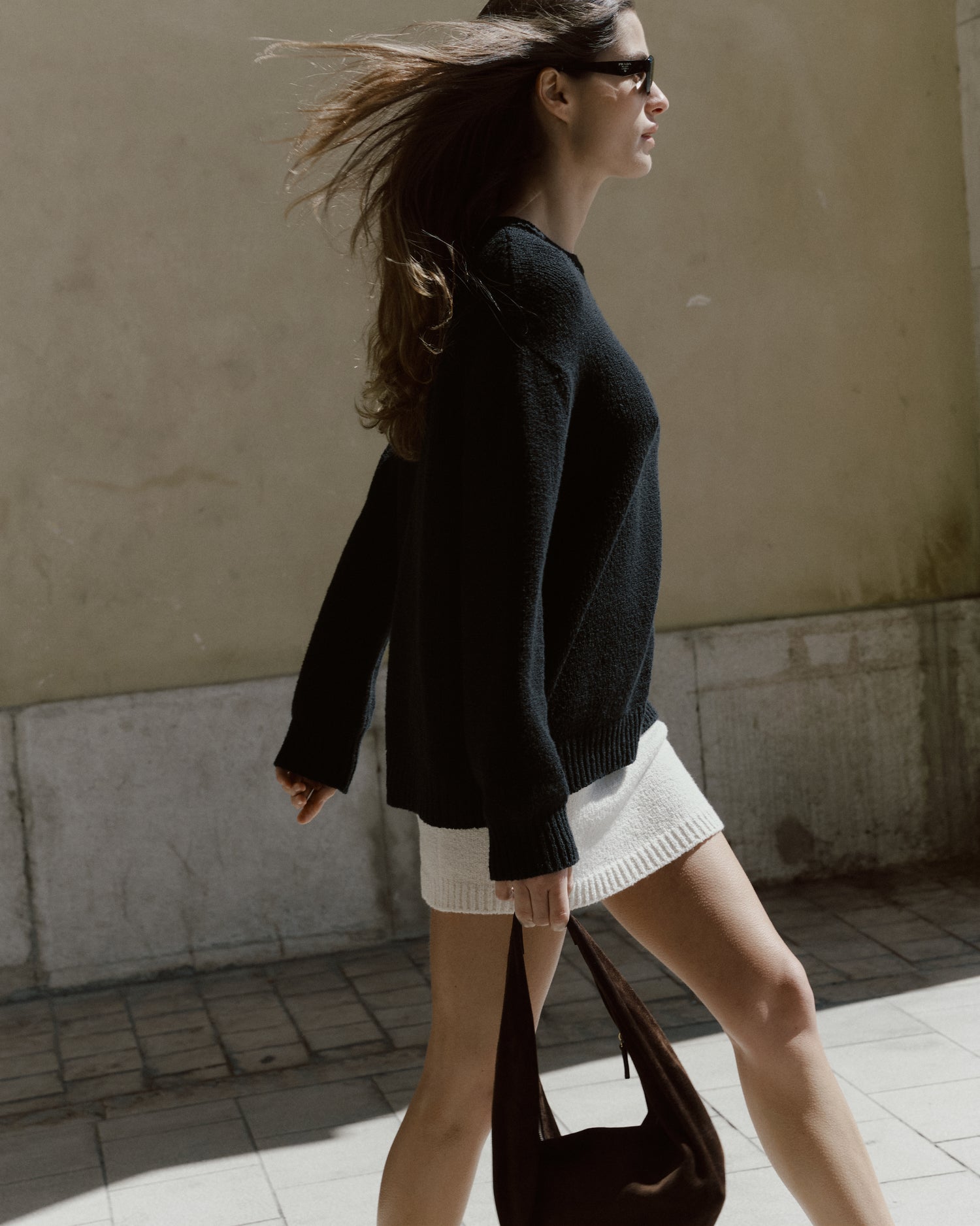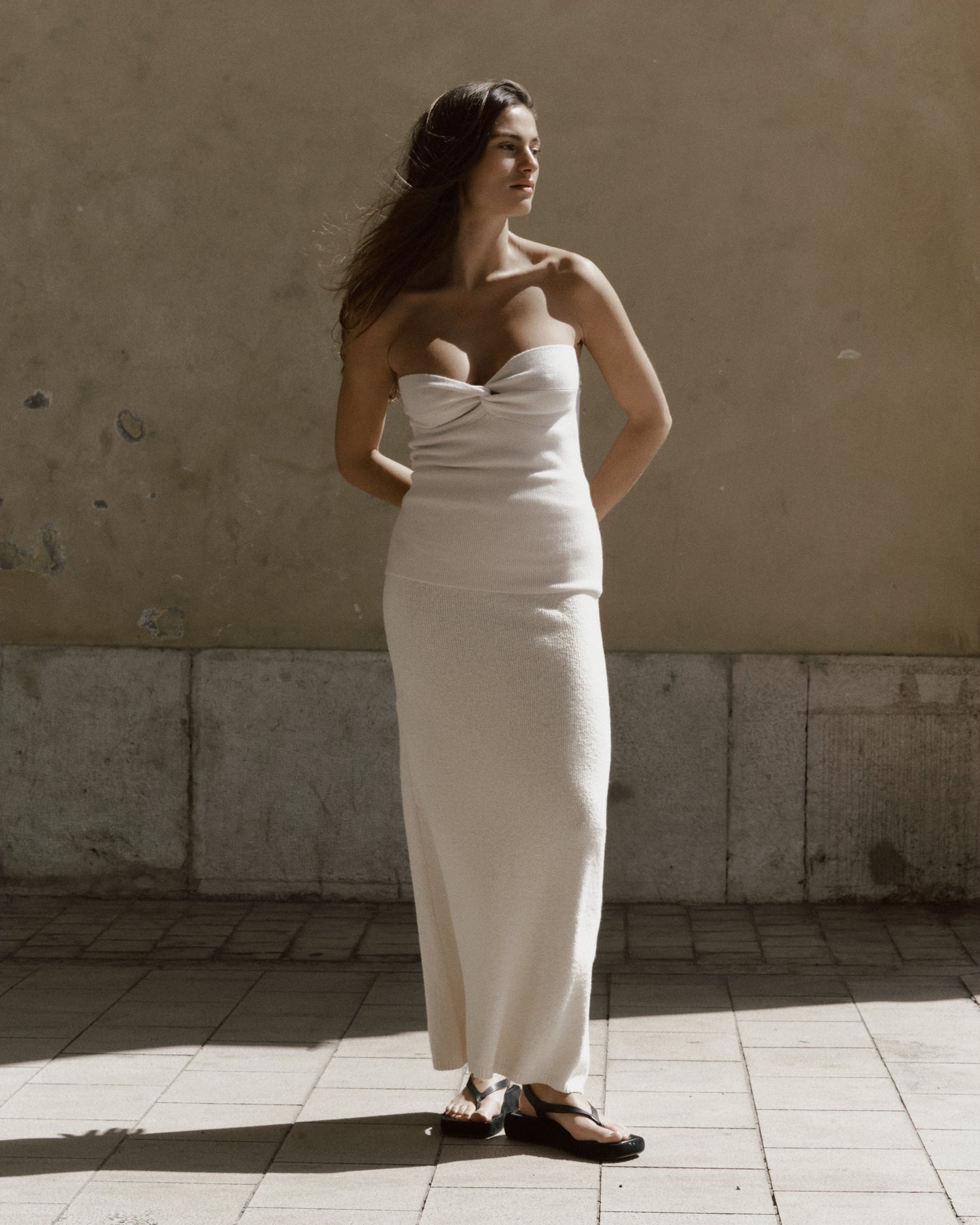A blend of soft simplicity and warm weather elegance in a classic monochrome palette with a touch of deep chocolate brown. Capturing the effortless essence of the season with minimal knitted co-ords and key seasonal silhouettes that transition seamlessly from elevated beach dressing to evening elegance.