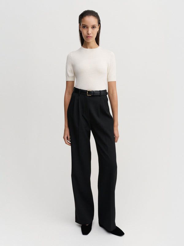 Amel Trousers are crafted from a soft recycled wool blend. Tailored to a high-waist, wide-leg silhouette with pressed front pleats that enhance the relaxed drape. Finished with adjustable side tabs that allow the trousers to be worn low or high on the waist.