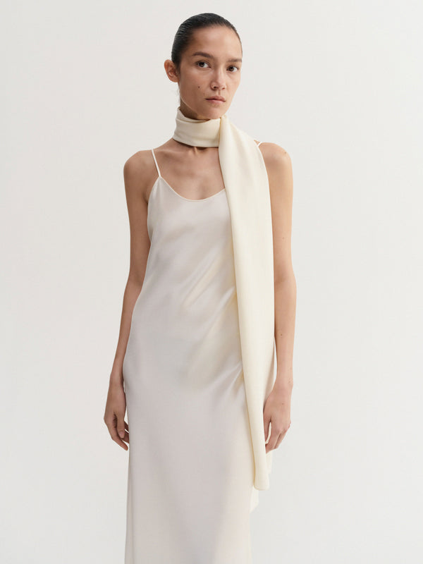 Duni Scarf is crafted from lightweight silk. Designed to drape elegantly around the neck or shoulders, layering naturally over evening dresses or tailoring.