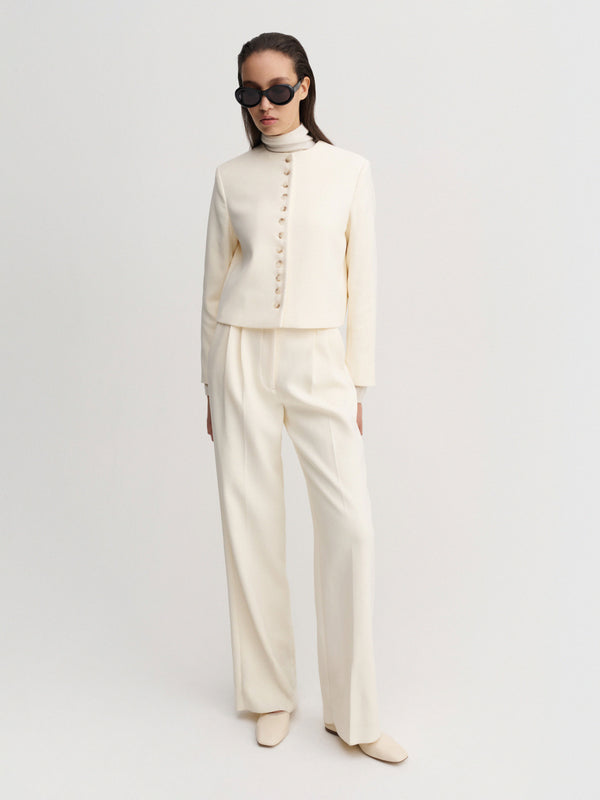 Funda Jacket is crafted from a soft recycled wool blend. Cut to a boxy, cropped silhouette with a clean, collarless neckline and structured shoulders. Finished with a row of buttons.