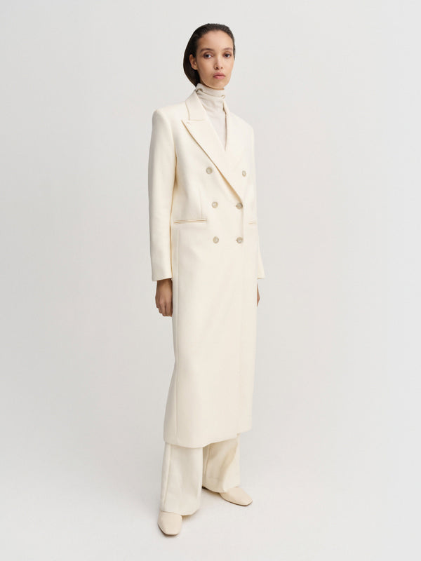 Margot Long Tailored Blazer is crafted from a soft recycled wool blend. Cut to a straight, midi-length silhouette with wide peak lapels and a double-breasted front. Finished with padded shoulders for a refined, structured shape.