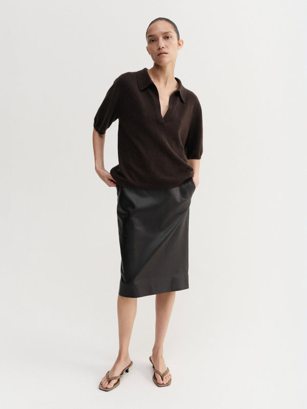 Nessa T-shirt is knitted from super soft cashmere, providing a smooth and itch-free feel against the skin. The sweater is designed for a timeless, laid-back fit with a slightly cropped hem. It is featured with a classic V-neckline that is framed by a plain polo collar. Completed with ribbed cuffs and hem.